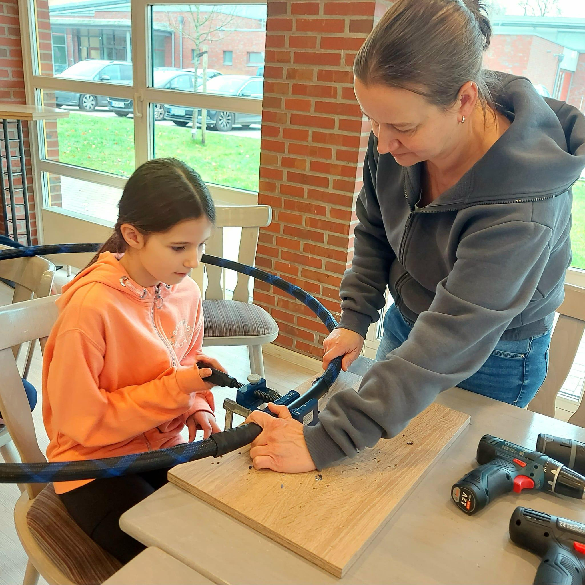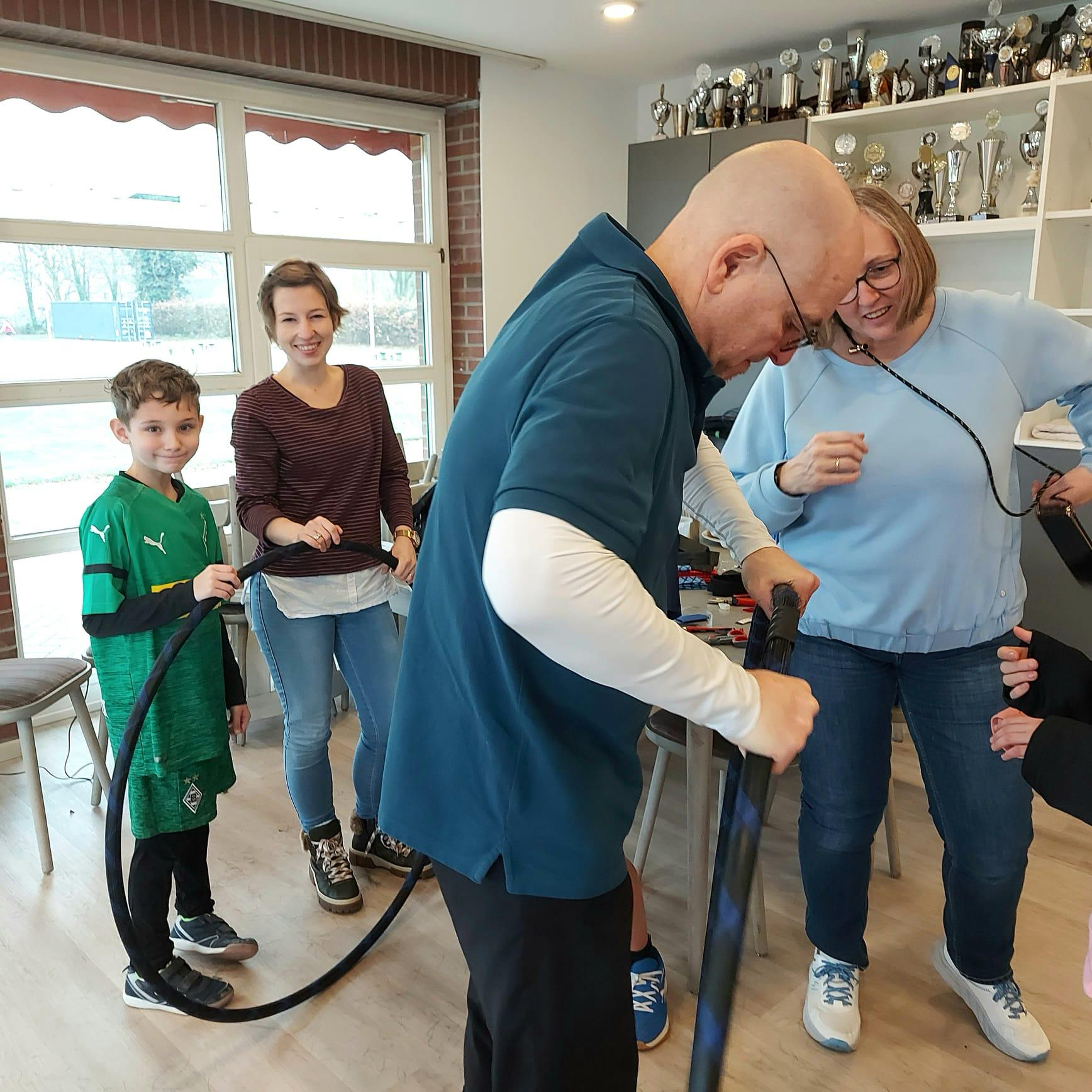 - Das Bauen und Testen von 40 professionellen Hula-Hoop-Reifen unter der Leitung von Christian Uch hat viel Spaß bereitet und war sehr motivierend, da es wirklich jedem gelang, den Reifen einige Male um die Hüfte kreisen zu lassen (auch den erwachsenen Helferinnen!). Die Reifen bleiben für den Sportunterricht in der Turnhalle und werden sicher noch viel Freude und Bewegung verbreiten.