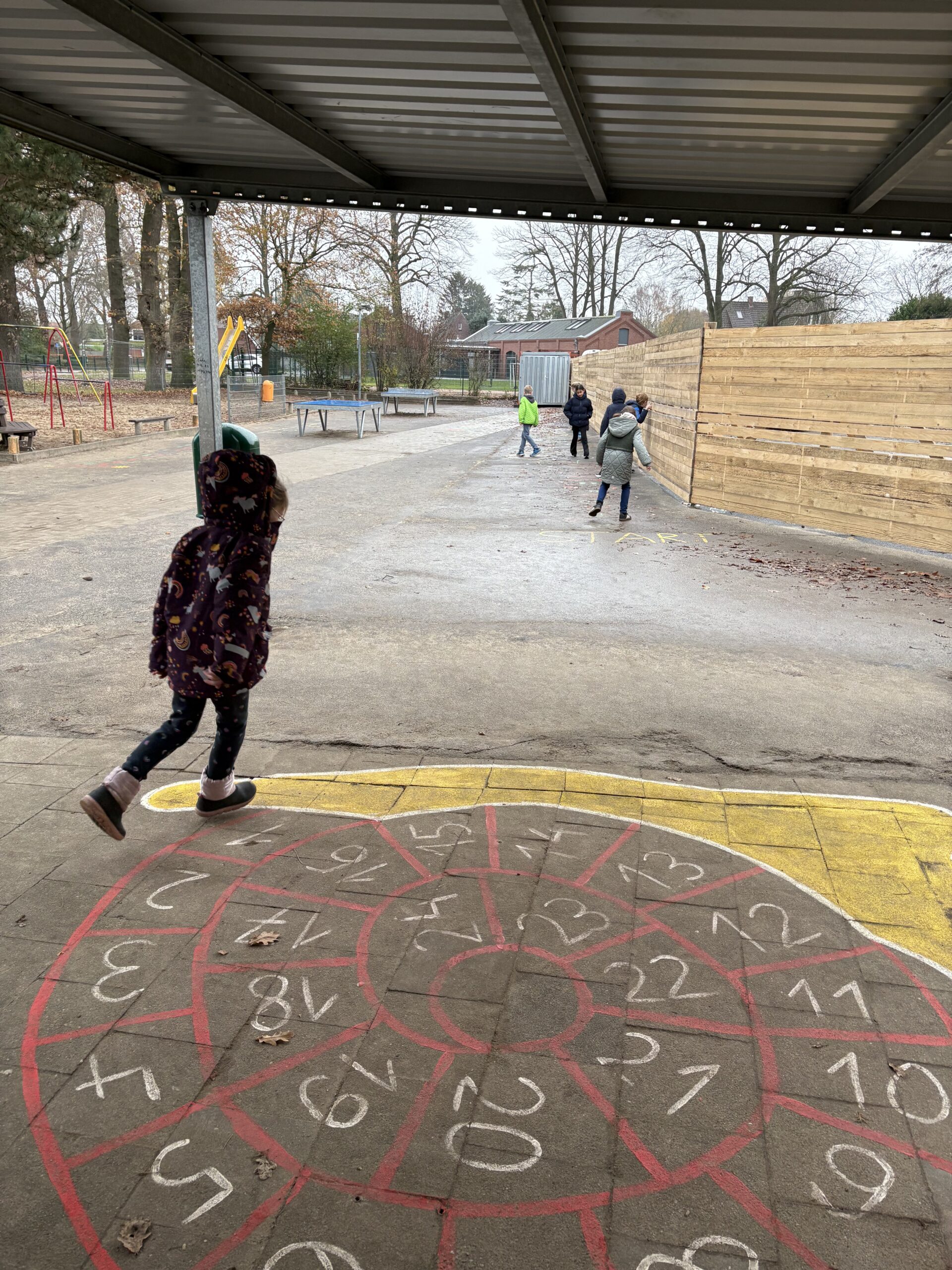 Durch die Einrichtung der Baustelle wurde der restliche Schulhof in seiner Größe durch eine Bauzaun mit Sichtschlitzen sehr begrenzt. Daher sind die Beschäftigungsmöglichkeiten in den Pausen sehr eingeschränkt. Wir haben uns daher einige Dinge überlegt, um den Kindern trotzdem genügend Spielmöglichkeiten zu bieten: